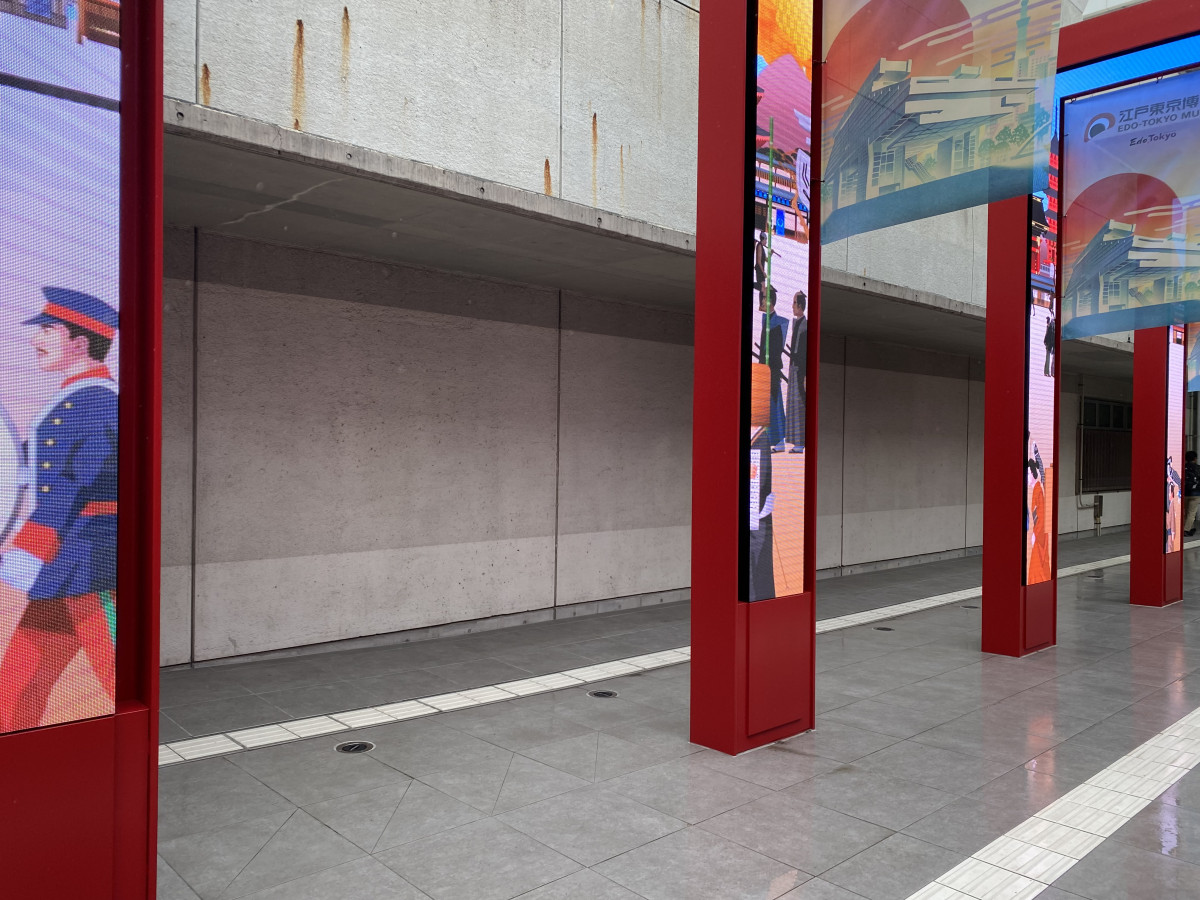 旅の終わりに私たちを現実へと送り出すのは、JR両国駅方面へと続く赤い鳥居を模したデジタル回廊だ。伝統的な朱色の柱のなかに埋め込まれたLEDディスプレイが、江戸から現代へと移り変わる東京の活気を鮮やかに映し出す。傘を差し、現代の東京の空気を吸い込みながらこの回廊を歩くとき、私たちは気づくはずだ。
