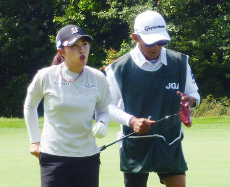 女子ゴルフの今季国内メジャー第3戦、日本女子オープン選手権は2日から兵庫・チェリーヒルズGCで行われる。1日は各選手が練習ラウンドで調整するなどした。写真は、コースを確認する古江彩佳(左)。 【時事通信社】