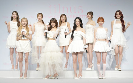 日韓共同で開発したコスメ「tilnus」の新製品・新CM発表会に登壇した、ブランドのイメージモデルを務める9人組ガールズグループNiziU=13日、都内 【時事通信フォト】