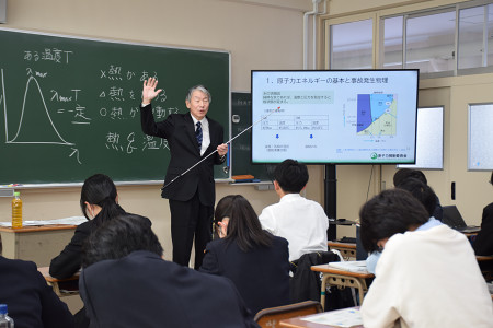 福島県郡山市の県立安積高校で、原子力規制委員会の山中伸介委員長が講演し、生徒と意見交換を行った。東京電力福島第1原発の廃炉や原発の再稼働について質問を受け、回答した=23日午後、福島県郡山市 【時事通信社】