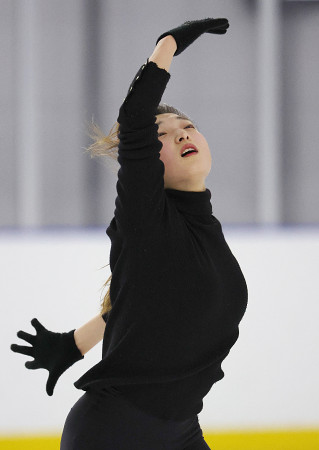 練習を公開したフィギュアスケート女子ミラノ・コルティナ五輪代表の坂本花織。現役最後のシーズンで迎える大舞台へ、「今の段階では楽しみが勝っている。もっと追い込んで練習したい」と語った=16日、神戸市 【時事通信社】