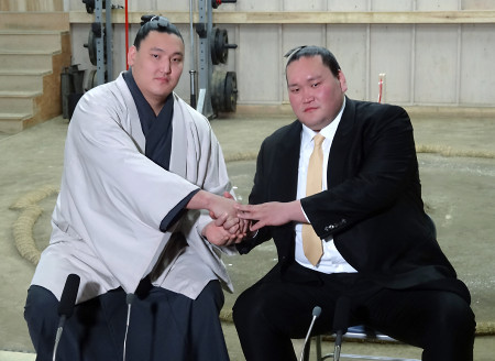 大相撲春場所(3月8日初日)の番付編成会議で新十両昇進が決まった寿之富士(左)が28日、東京都墨田区にある伊勢ケ浜部屋の稽古場で記者会見し、「うれしい」と表情を緩めた。右は伊勢ケ浜親方。 【時事通信社】