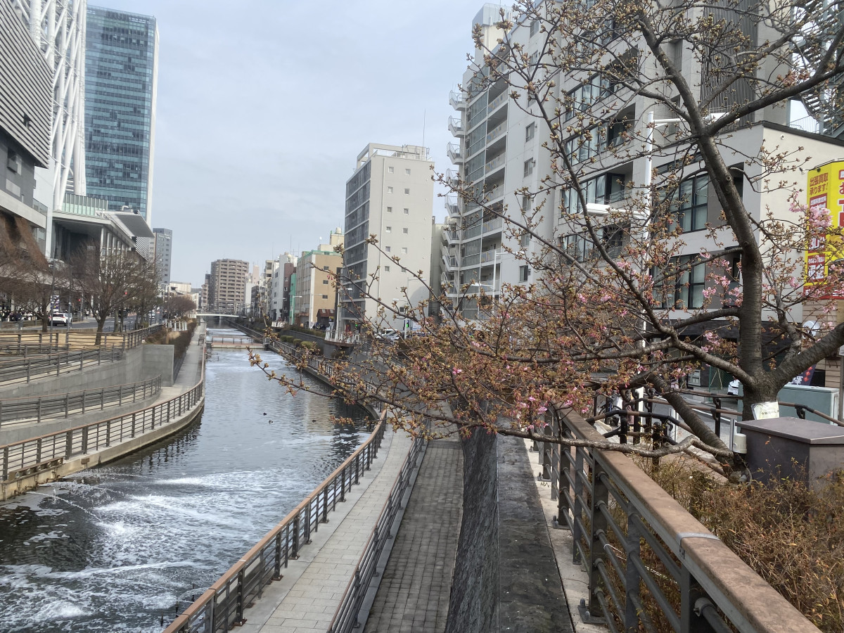 押上の北十間川沿い、東武橋付近(墨田区押上1)で河津桜が開花し、川沿いを歩く人や足を止めて写真を撮る人の姿が見られる。