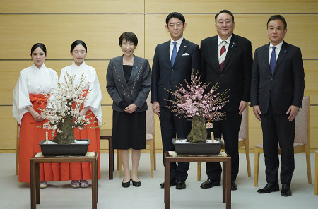 高市早苗首相(左から3人目)は16日、梅の名所として知られる太宰府天満宮(福岡県太宰府市)の西高辻信宏宮司ら「梅の使節」の表敬を首相官邸で受けた=同日午後 【時事通信社】