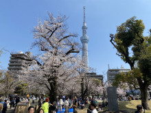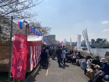 隅田川沿いの墨堤のソメイヨシノが見頃を迎えた3月28日、隅田公園(墨田区向島1)周辺では多くの花見客でにぎわいを見せた。