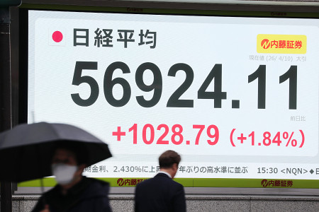 10日の東京株式市場で、日経平均株価の終値は前日比1028円79銭高の5万6924円11銭と大幅に上昇した。好決算を発表した銘柄が急伸して日経平均を押し上げた=東京都中央区 【時事通信社】