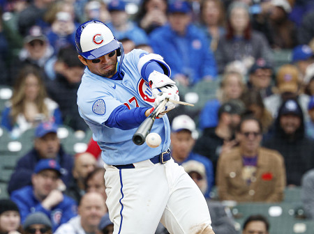 パイレーツ戦の4回、安打を放つカブスの鈴木。負傷者リストから復帰して5番右翼で今季初出場を果たし、3打数1安打、1四球だった。カブスは0―2で敗れた=10日、シカゴ 【ロイター時事】