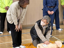 当日、体育館では、災害時に必要な簡易トイレを段ボールで実際に組み立て、ビニール袋に凝固剤と水を入れて固める実演を行った。続いて、消防署員が心肺蘇生法やAED(自動体外式除細動器)の使い方を指導し、住民が真剣な表情で体験に臨んだ。