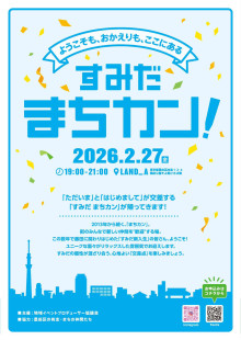 地域交流イベント「すみだ まちカン! ~街のみんなで新しい仲間を『歓迎』するつどい~」が2月27日、カフェ&ダイニング「LAND_A(ランド エー)」(墨田区向島1)で行われる。主催は「地域イベントプロデューサー協議会」