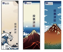 投票済証は、千葉大学デザイン・リサーチ・インスティテュート(dri)の知見を生かして制作。これまでも冨嶽三十六景の「神奈川沖浪裏(なみうら)」「山下白雨」「凱風(がいふう)快晴」をモチーフにしたデザインを展開してきた。