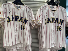 ユニホームはホーム用デザインを中心に、選手名や背番号入りの商品も展開。大谷翔平選手の背番号「16」やネーム入りグッズも多く並び、来店客が手に取ってデザインやサイズ感を確かめる様子が見られる。