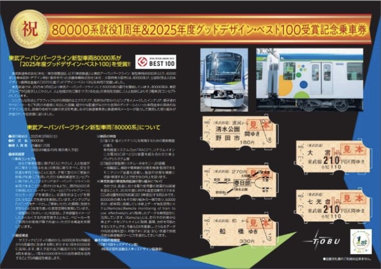 東武鉄道(墨田区押上2)が3月8日、新型車両「80000系」の就役1周年と「2025年度グッドデザイン・ベスト100」受賞を記念した乗車券を発売する。車両を運行する東武アーバンパークライン(野田線)沿線だけでなく、墨田区内の主要駅でも販売する。