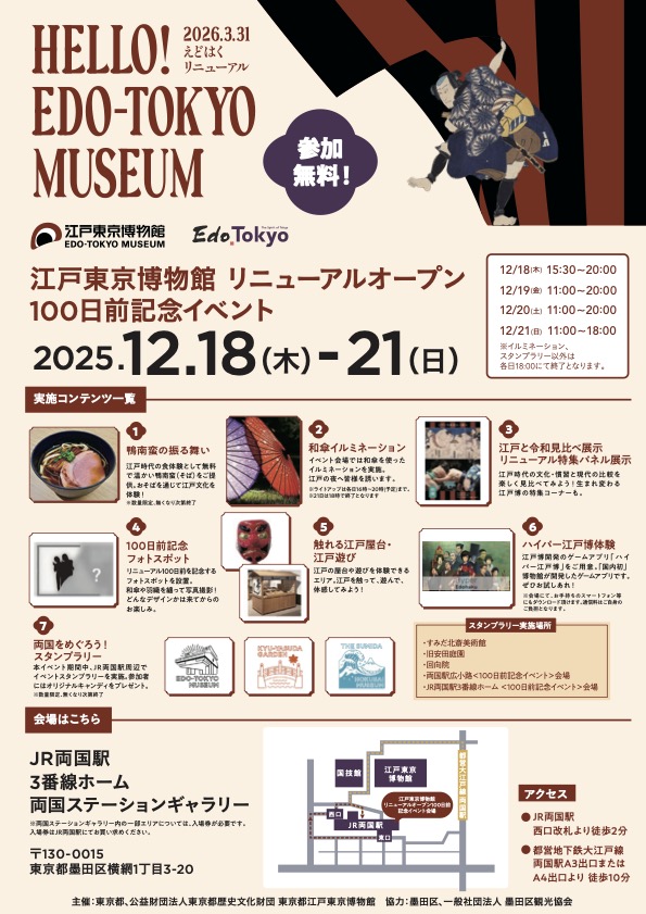 東京都江戸東京博物館(墨田区横網1、通称=江戸博)が12月18日から、リニューアルオープン100日前を記念した「江戸東京博物館 リニューアルオープン100日前イベント」をJR両国駅3番線ホームで行う。