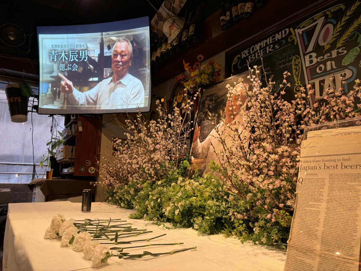 会場正面に設けられた献花台。スクリーンには「麦酒倶楽部ポパイ創業者 青木辰男 偲ぶ会」と映し出された。