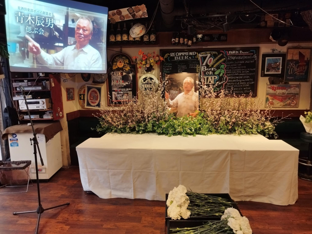 両国のクラフトビール店「麦酒倶楽部ポパイ」(墨田区両国2)の創業者で、昨年11月9日に73歳で亡くなった青木辰男さんをしのぶ会が1月25日、同店で行われた。