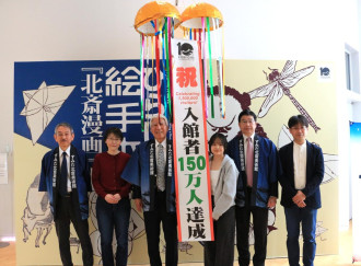 すみだ北斎美術館(墨田区亀沢2)の累計入館者数が150万人に達し、3月22日、同館で記念セレモニーが行われた。