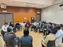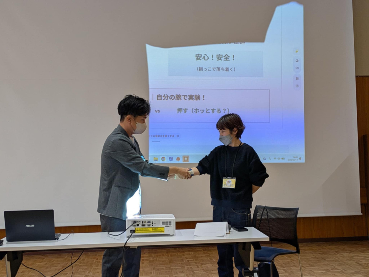 「基礎3感覚で日常をととのえる―てっこジムの感覚統合入門―」を講演したTECCO合同会社代表 作業療法士の森雄一さんがタッチングの方法を紹介。モデルは主催者の三井田さん