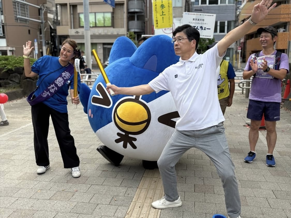 墨田区内の名産「寺島なす」を先端に取り付けたトーチをつなぐ「すみだ青果リレー」が10月5日、ゴール地点の錦糸公園(墨田区錦糸4)に到着した。