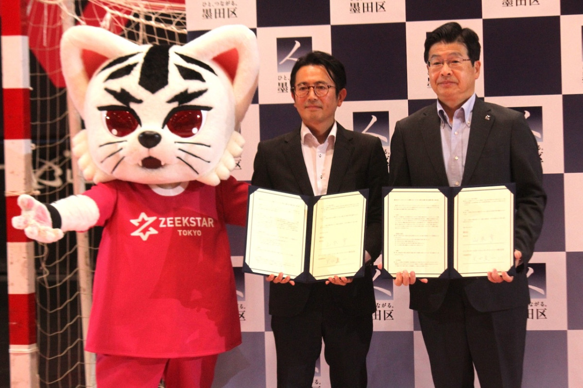 ハーフタイムには、ジークスター東京と墨田区のホームタウン・スポーツチーム連携協定の締結で、墨田区の山本亨区長(右)とジークスター東京の黒田真一社長(中央)が調印した。(撮影=大塚淳史)