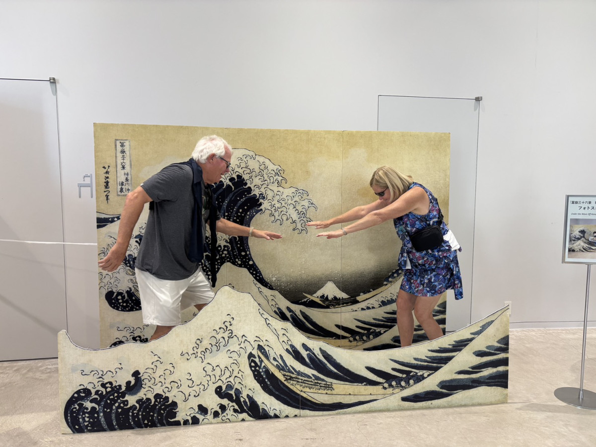 冨嶽三十六景の「神奈川沖浪裏」を背景にポーズを取る