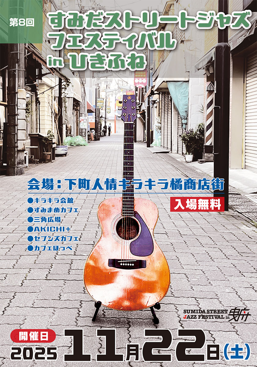 音楽イベント「すみだストリートジャズフェスティバル in ひきふね」が11月22日、曳舟エリアのキラキラ橘商店街周辺で開かれる。