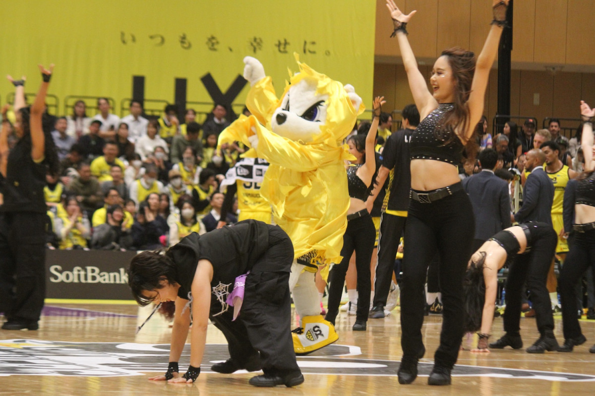 Bリーグ・サンロッカーズ渋谷がひがしんアリーナで3シーズンぶりにリーグ戦開催。マスコットキャラクターのサンディやチアが場内を盛り上げた(撮影=大塚淳史)