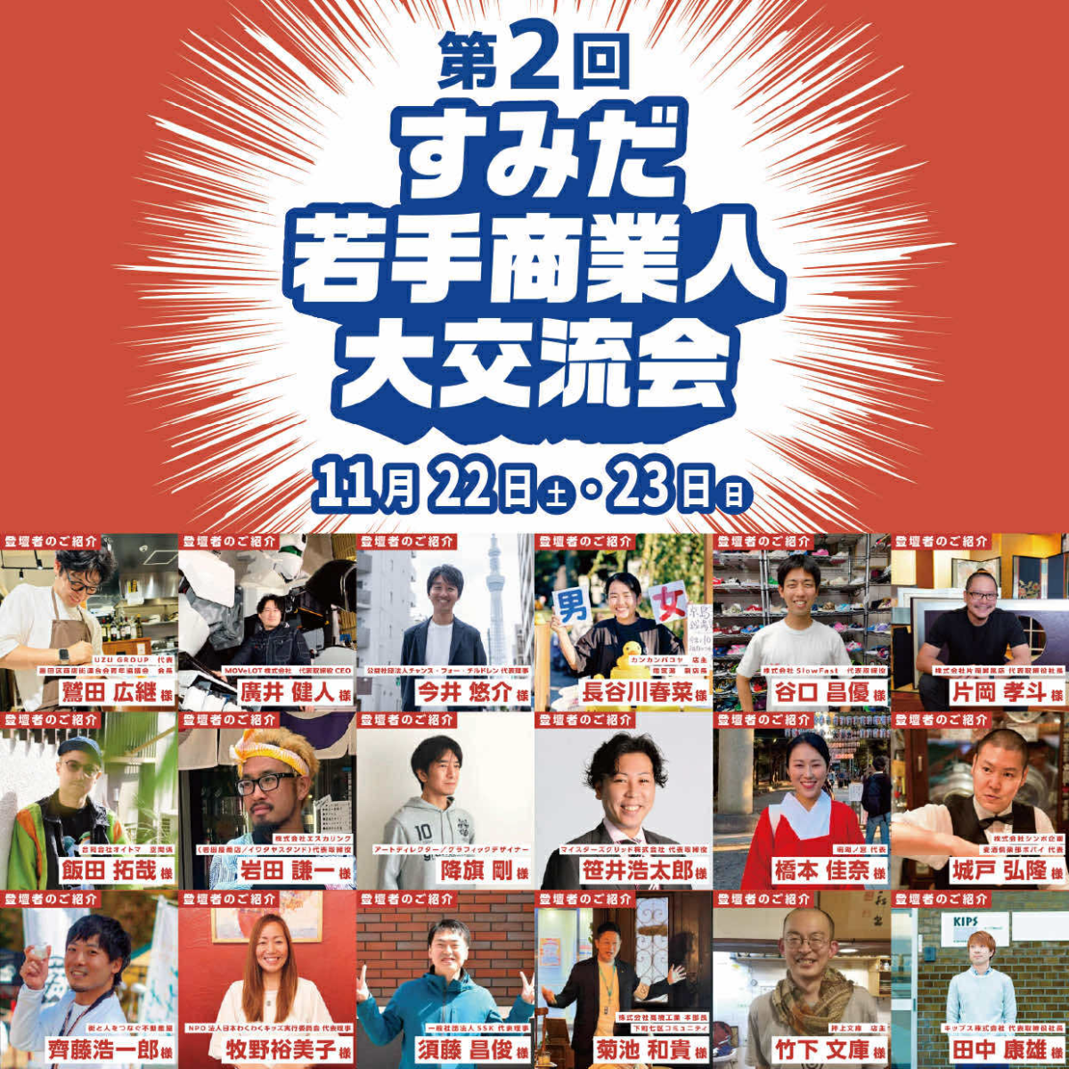 50歳以下の経営者や後継者らが世代や業種を超えて交流するイベント、「第2回すみだ若手商業人大交流会」が11月22日・23日、隅田公園(墨田区向島1)そよ風ひろば・芝生広場・交流広場・穂と香で開かれる。