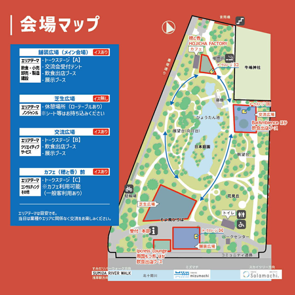 50歳以下の経営者や後継者らが世代や業種を超えて交流するイベント、「第2回すみだ若手商業人大交流会」が11月22日・23日、隅田公園(墨田区向島1)そよ風ひろば・芝生広場・交流広場・穂と香で開かれる。