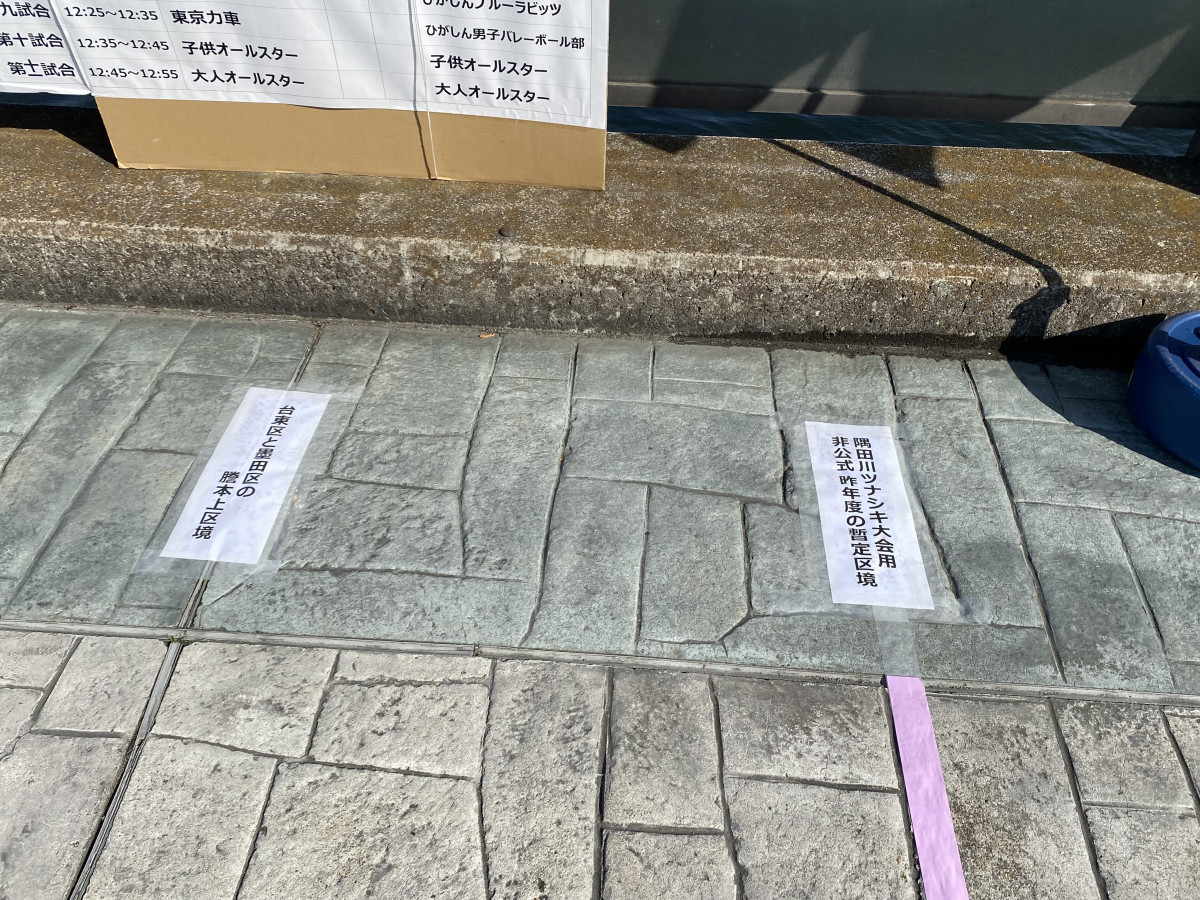 左は「台東区と墨田区の謄本上区境」、右は昨年1メートル移動した「隅田川ツナシキ大会用、非公式の暫定区境」