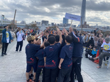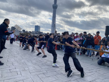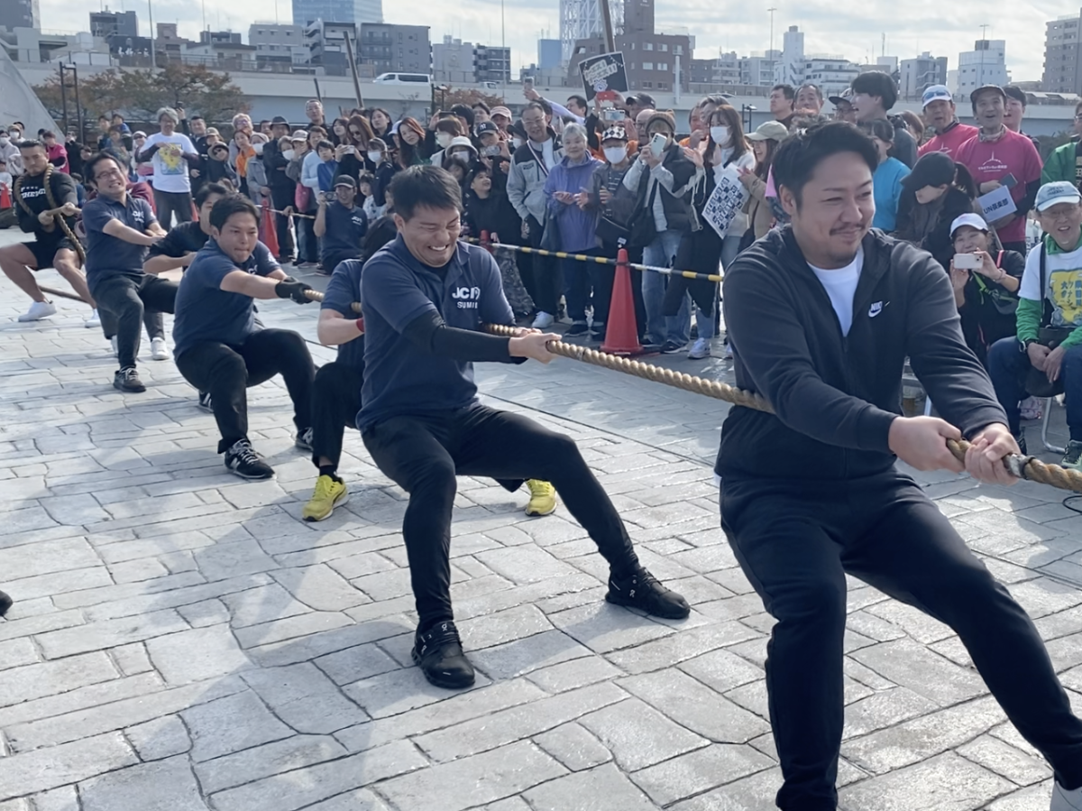 墨田区と台東区を結ぶ桜橋(墨田区向島5)で11月16日、両区の代表が綱引きで競う「隅田川ツナシキ大会2025」が行われた。