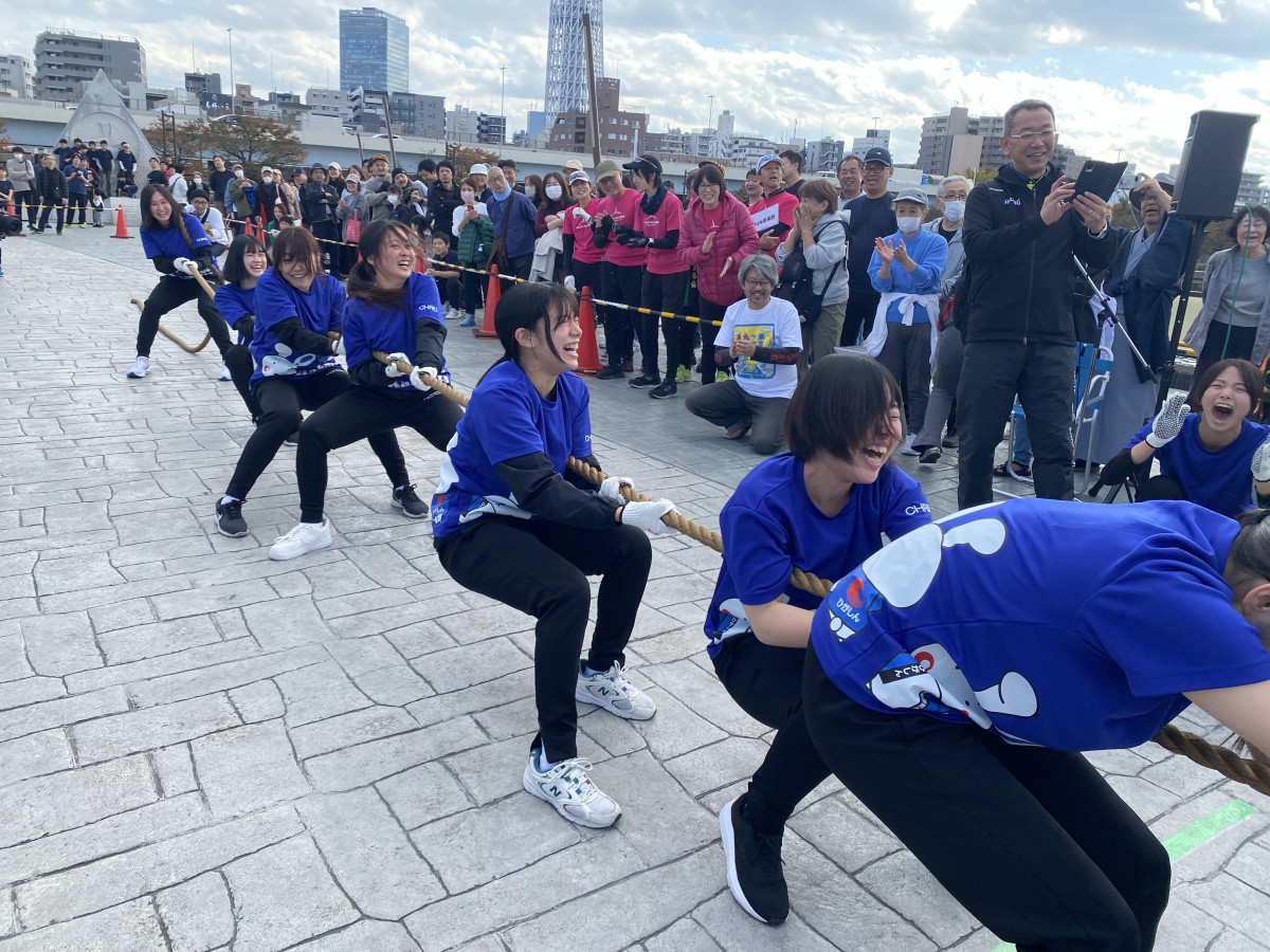 墨田区と台東区を結ぶ桜橋(墨田区向島5)で11月16日、両区の代表が綱引きで競う「隅田川ツナシキ大会2025」が行われた。