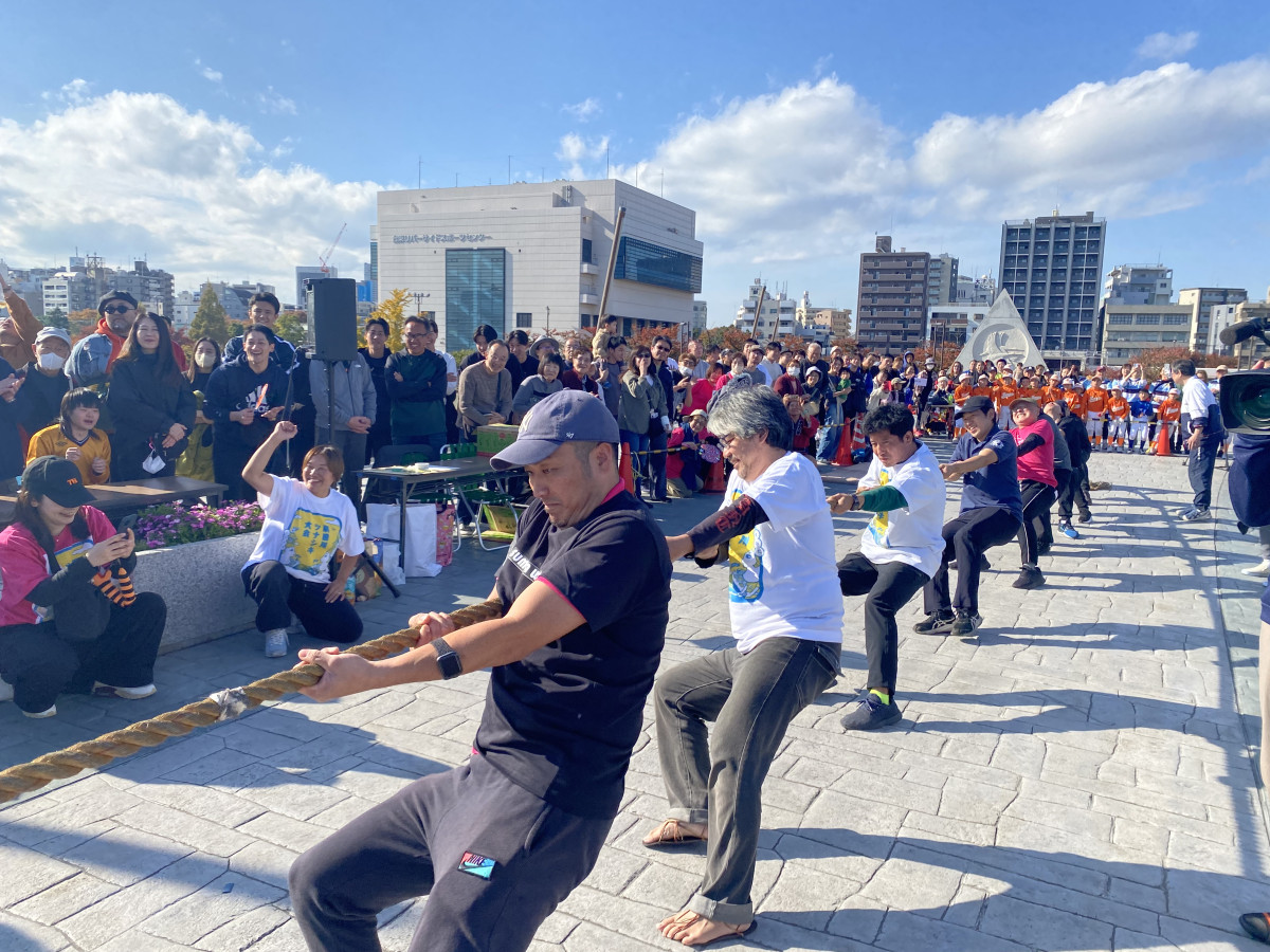 墨田区と台東区を結ぶ桜橋(墨田区向島5)で11月16日、両区の代表が綱引きで競う「隅田川ツナシキ大会2025」が行われた。