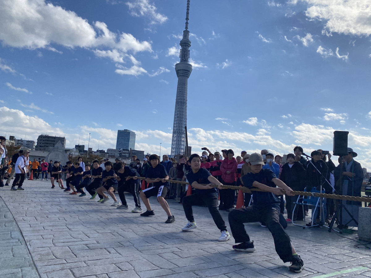 墨田区と台東区を結ぶ桜橋(墨田区向島5)で11月16日、両区の代表が綱引きで競う「隅田川ツナシキ大会2025」が行われた。