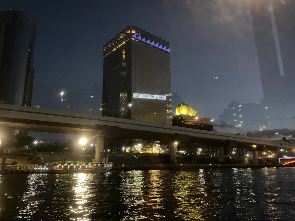アサヒビール本社ビルの壁面に映ったスカイツリーも楽しめる