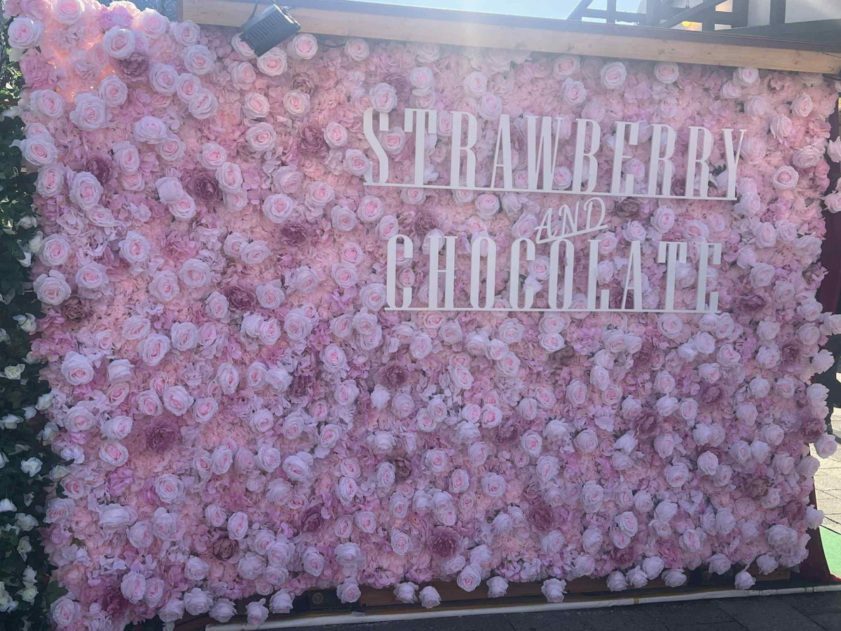 ピンクのバラで装飾された「THE FIRST EVENT OF STRAWBERRY AND CHOCOLATE(ストロベリー&チョコレート)」のロゴ