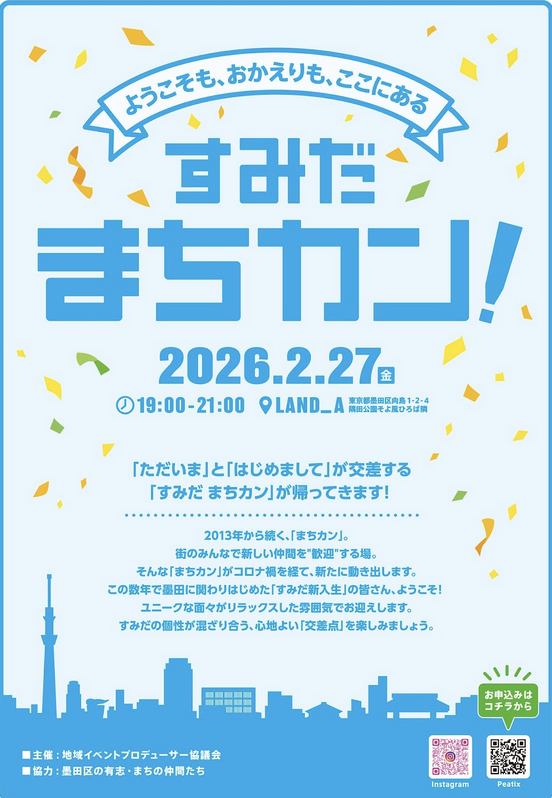 地域交流イベント「すみだ まちカン! ~街のみんなで新しい仲間を『歓迎』するつどい~」が2月27日、カフェ&ダイニング「LAND_A(ランド エー)」(墨田区向島1)で行われる。