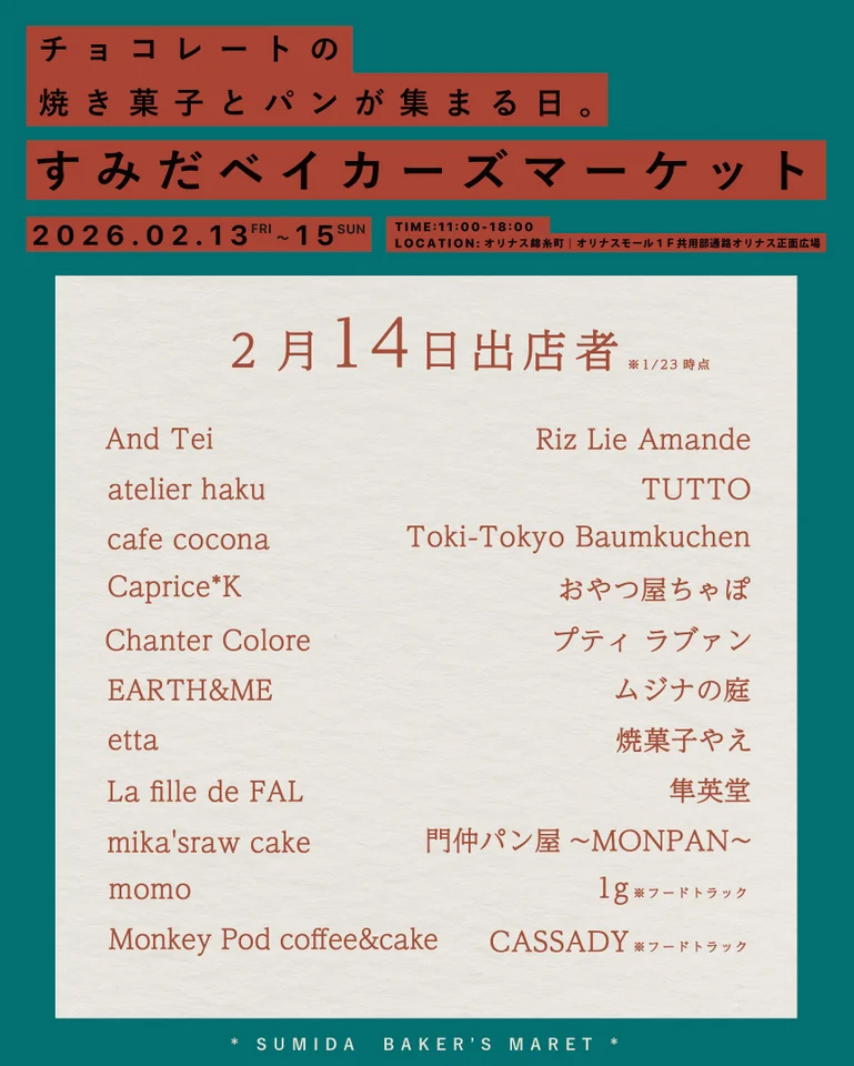 チョコレートの焼き菓子とパンをテーマにしたイベント「すみだベイカーズマーケット」が2月13日~15日の3日間、オリナス錦糸町(墨田区太平4)で開かれる。