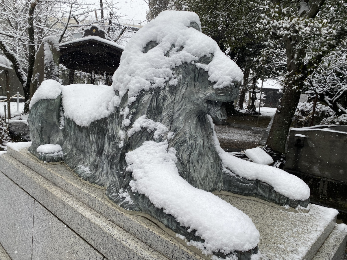 三囲神社のライオン像も雪化粧