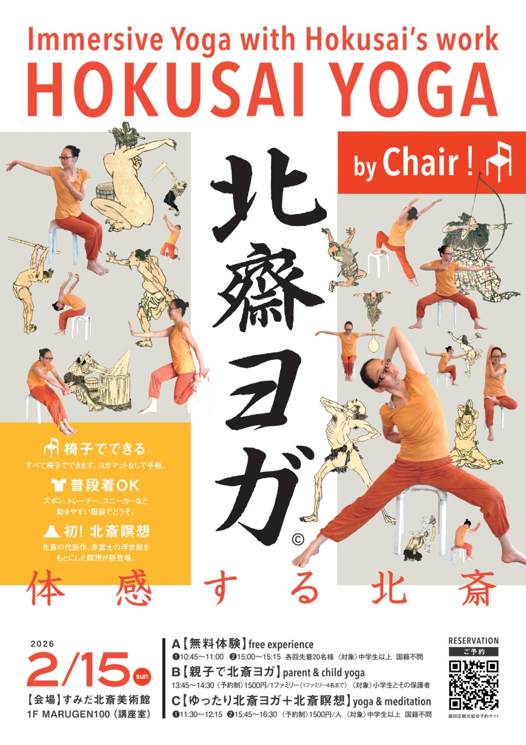 葛飾北斎の作品世界を身体で体感するイベント「椅子でできる『北斎ヨガ&北斎瞑想』」が2月15日、すみだ北斎美術館(墨田区亀沢2)1階「MARUGEN100」(講座室)で行われる。