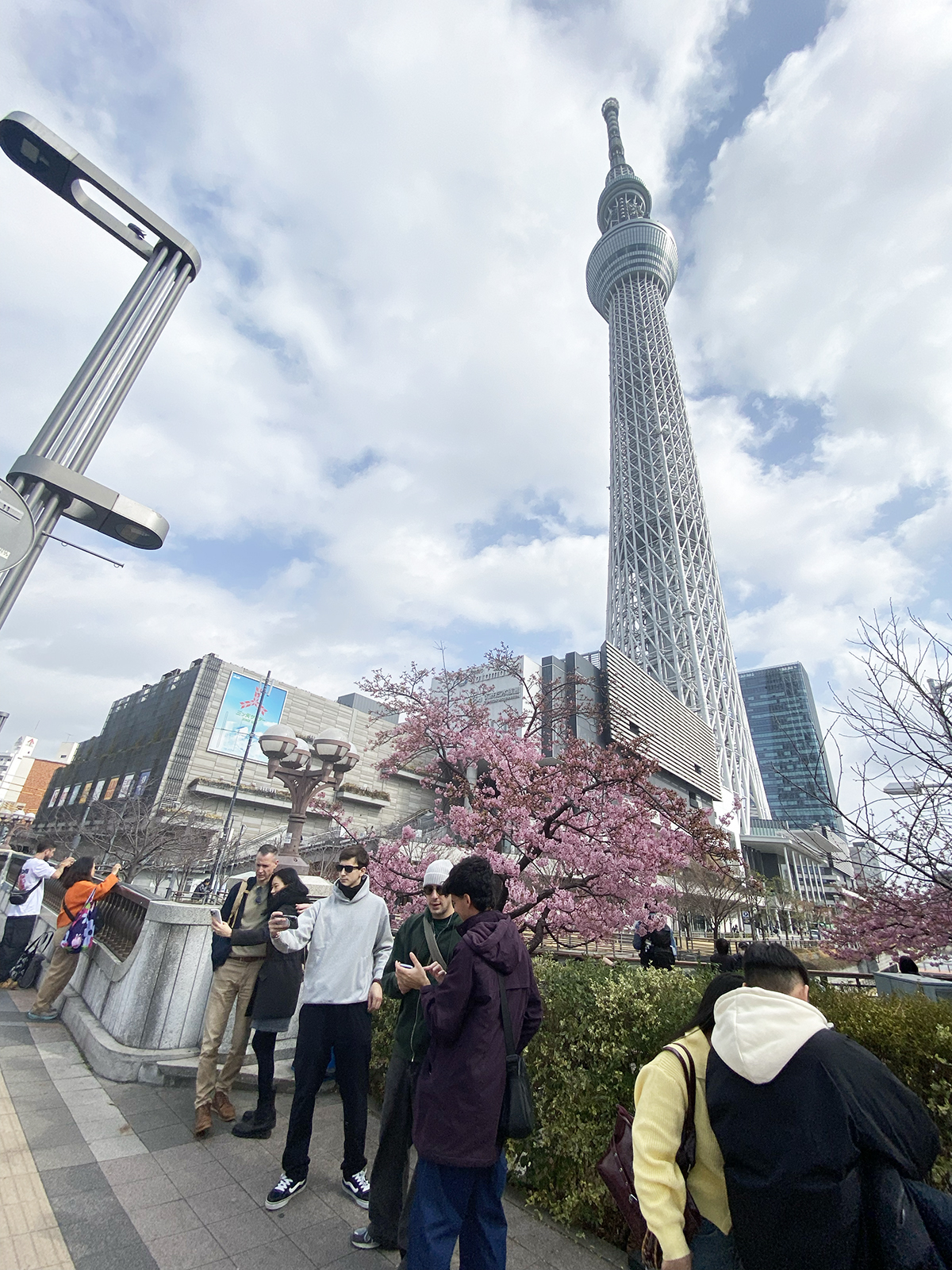 河津桜と東京スカイツリーを背景に写真撮影を楽しむ来訪者の姿も
