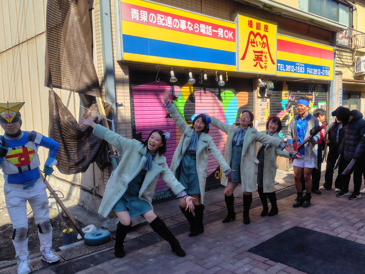 キラキラ橘商店街をパレードする「帰ってきたキューピッドガールズ」とスミダマン