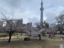 隅田川沿いの墨堤で3月26日、ソメイヨシノの開花が進み、花見客が足を止めて桜を見上げる姿が見られた。