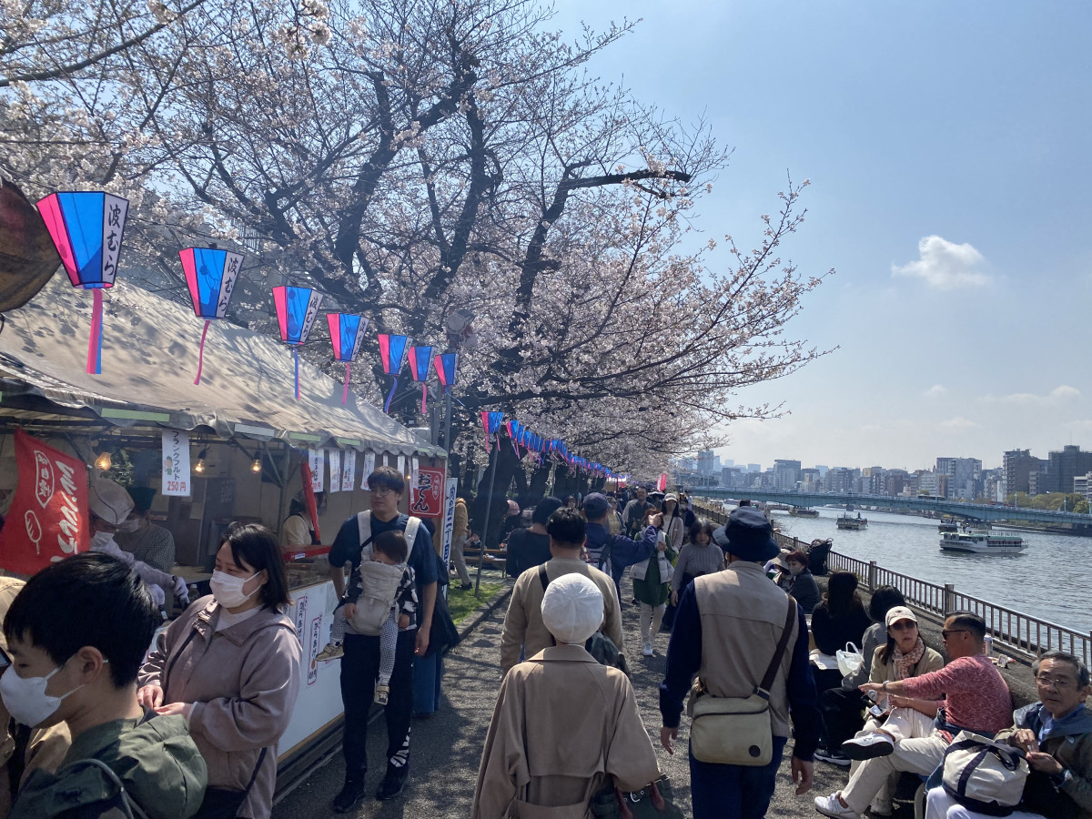 隅田川沿いの墨堤のソメイヨシノが見頃を迎えた3月28日、隅田公園(墨田区向島1)周辺では多くの花見客でにぎわいを見せた。