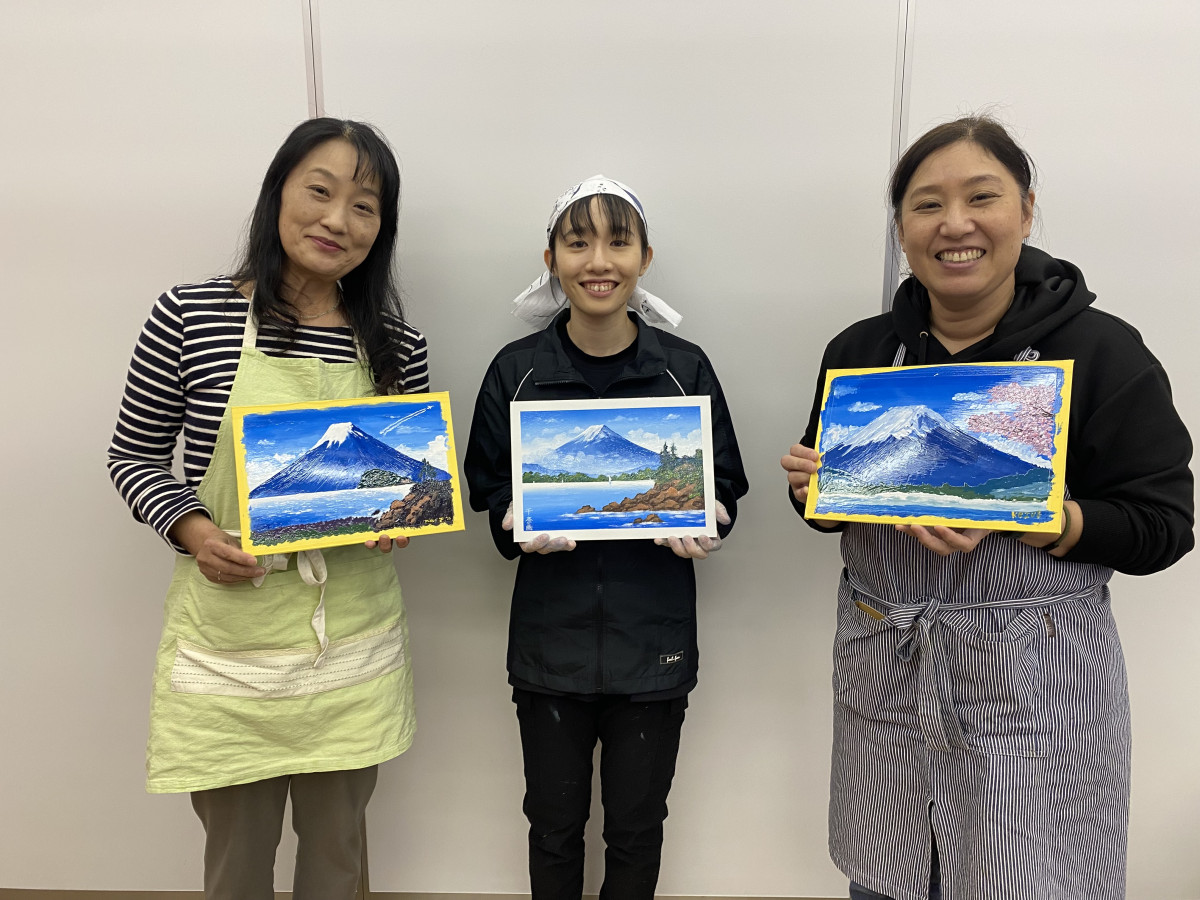 描き上げた絵を持つ受講生と千奈さん