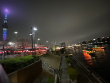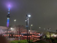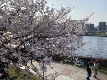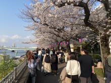 隅田川沿いの墨堤の桜が満開を迎え、花見客でにぎわっている。