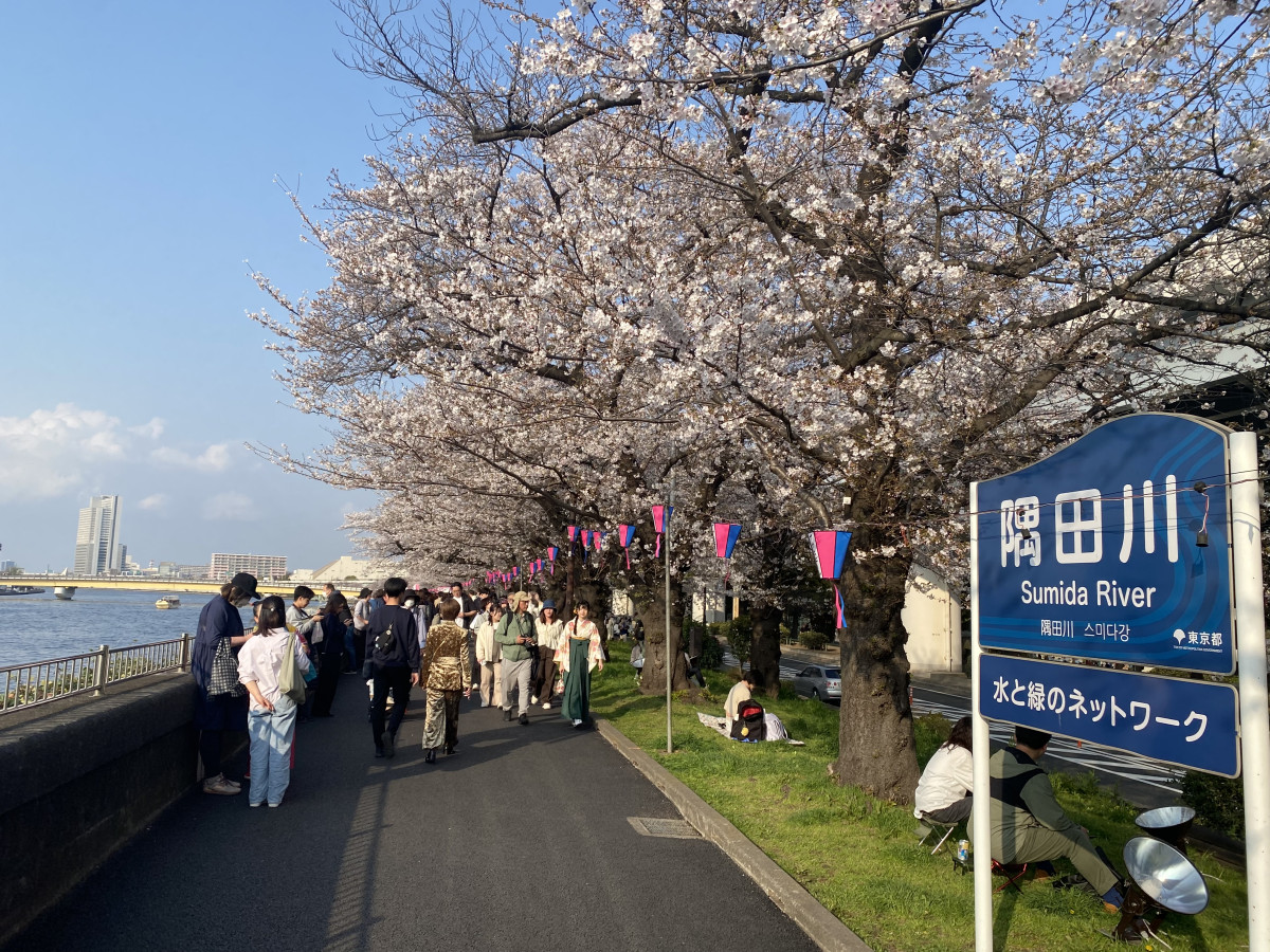 隅田川沿いの墨堤の桜が満開を迎え、花見客でにぎわっている。