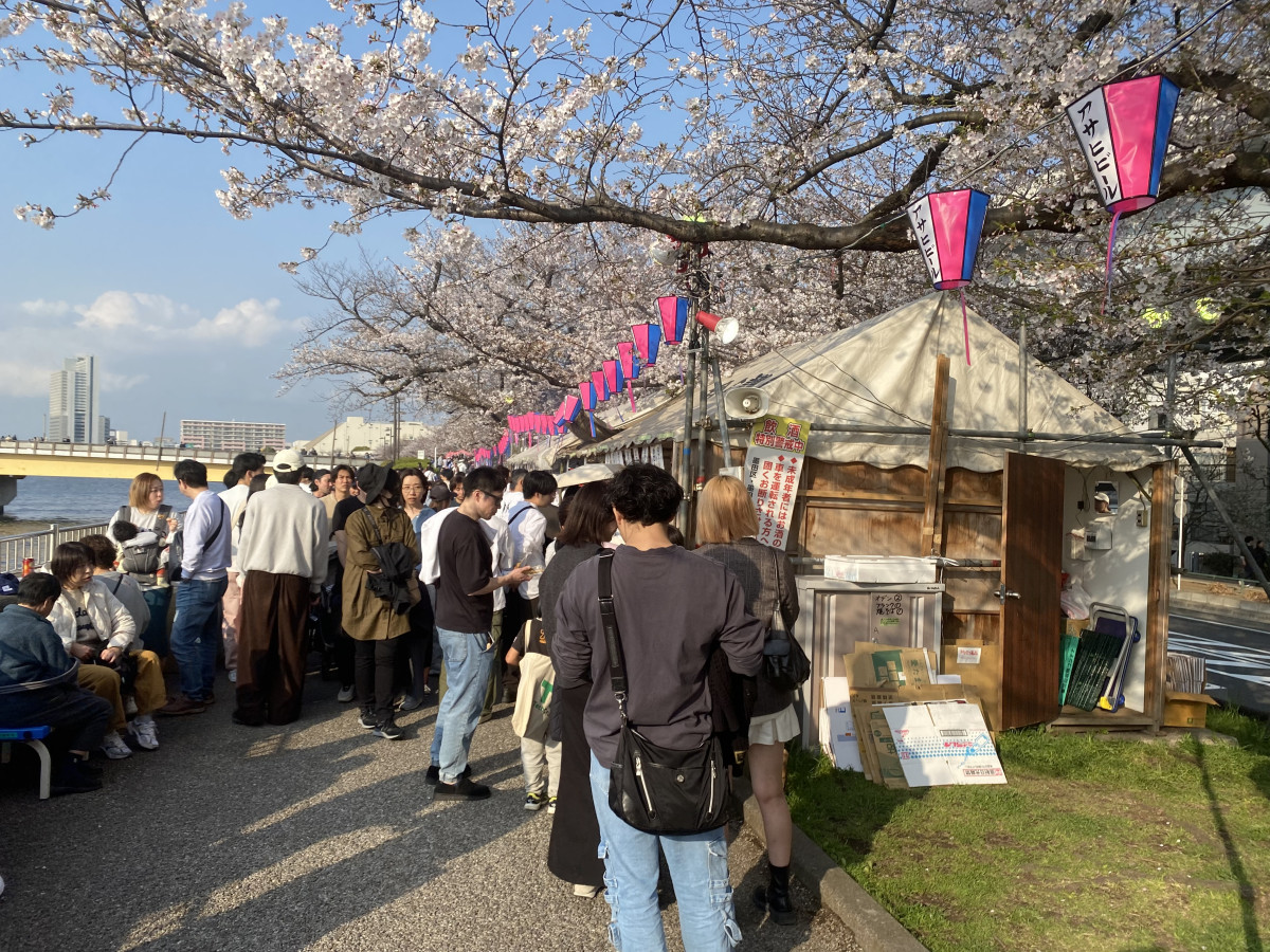 隅田川沿いの墨堤の桜が満開を迎え、花見客でにぎわっている。