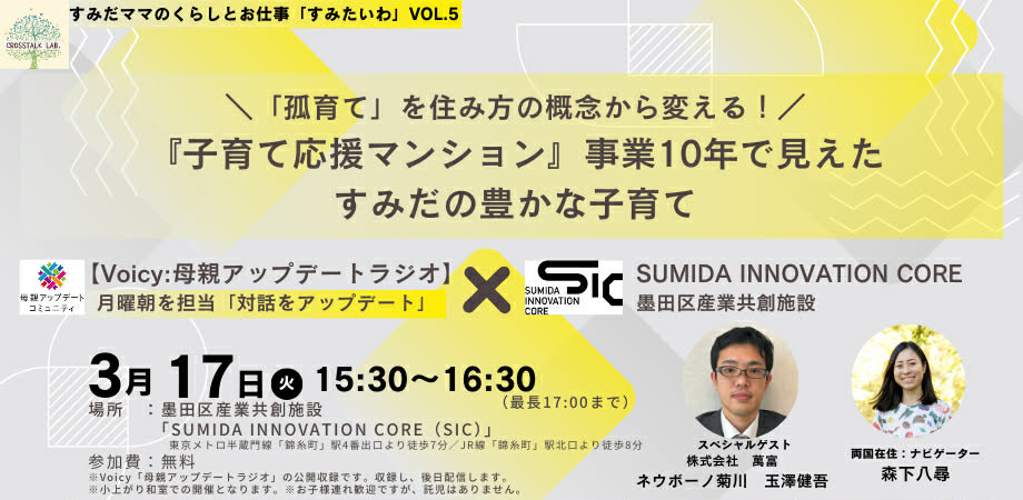 音声メディア「Voicy」の番組「母親アップデートラジオ」の公開収録イベントが3月17日、墨田区産業共創施設「SUMIDA INNOVATION CORE(SIC)」(墨田区錦糸4)で行われる。
